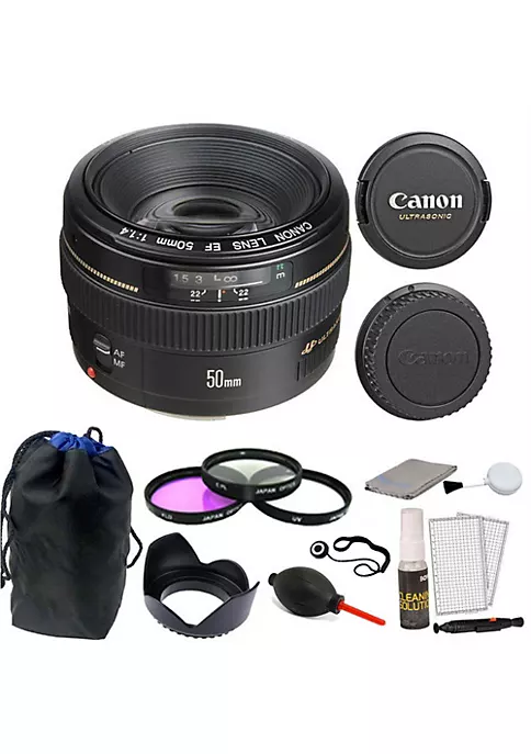 Canon EF 50mm f/1.4 USM Lens-This EF 50mm f/1.4 USM Lens from Canon is a standard length lens featuring superb quality and portability. Its f1.4 maximum aperture makes it very effective in low light situations and able to provide shallow depth of field focus. Two high-refraction lens elements and new Gaussian optics eliminate astigmatism and suppress astigmatic difference. Its ultrasonic autofocus motor (USM) enables fast, smooth and silent autofocus action and full-time manual focus override allows for the precision of manual focus even in One Shot AF mode. 58mm Filter Kit – These filters are manufactured from high quality solid optics. Each individual filter is heat treated and coated to avoid any rare movement or distortion.UV Protective Filter removes or absorbs ultra violet rays, giving sharper contrast to your film or video. Protects your lens from scratches or fingerprints. 58mm Tulip Lens Hood- This 58mm Pro Series Hard Tulip Shaped Lens Hood prevents image-degrading lens flare by blocking stray light from striking the surface of the lens. It also assists in keeping moisture or wind blown debris off the lens. It protects the front barrel from the inevitable impacts against walls, door frames and other real life obstacles. Lens Cap Holder. Dust Blower – Air Blower- easily removes dust and dirt particles from your electronic equipment. Includes Pouch.5PC Cleaning Kit – Removes fingerprints, dust, blemishes, and debris from camera lens and LCD screen. Includes two universal screen protectors, lens pen, cleaning solution, microfiber cleaning cloth and blower brush. Leaves no scratches, streaks or marks after use